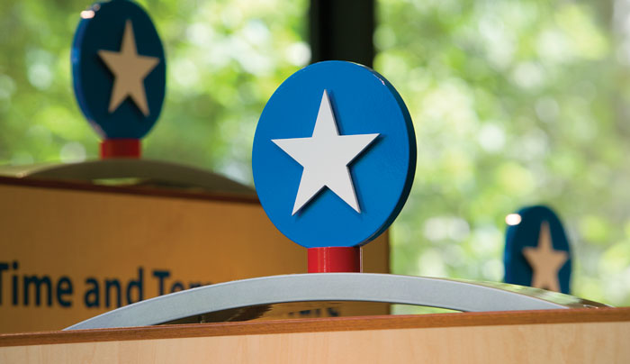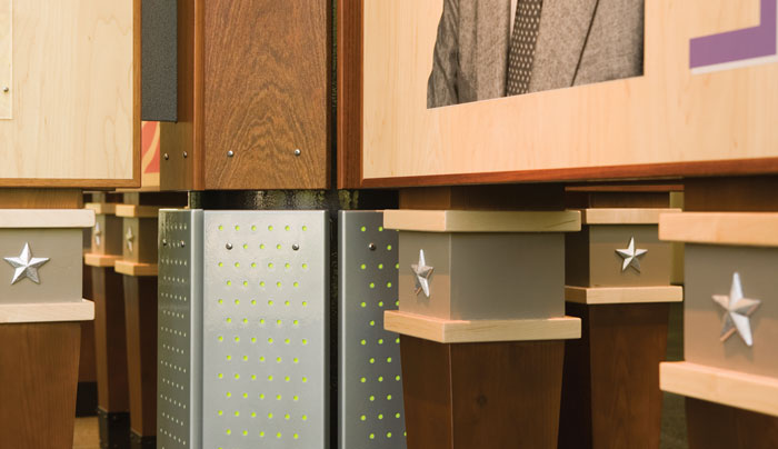 A detail of the display shows the protective Plexiglas covering over each of the custom-fabricated and powder-coated aluminum panels.