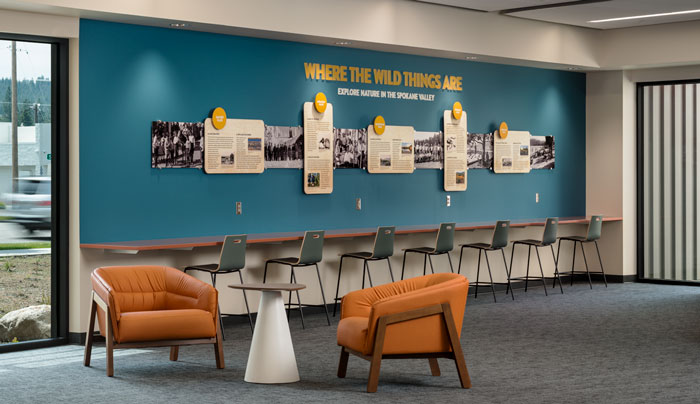 The Spokane Valley Library, one of ten branches operated by the Spokane County Library District, serves more than 270,000 visitors per year. The library’s new Integrus-designed building features an interpretive display that encourages visitors to explore local recreational areas and learn more about their historical importance.